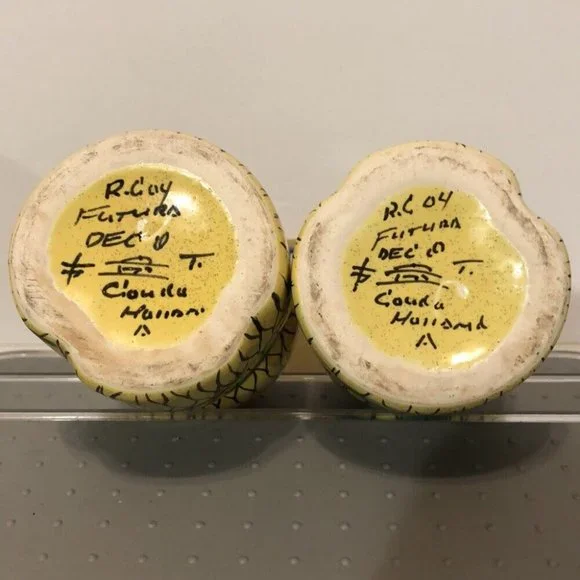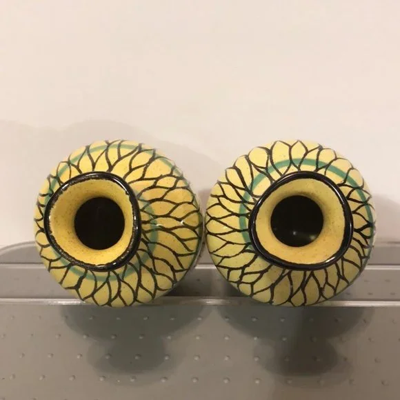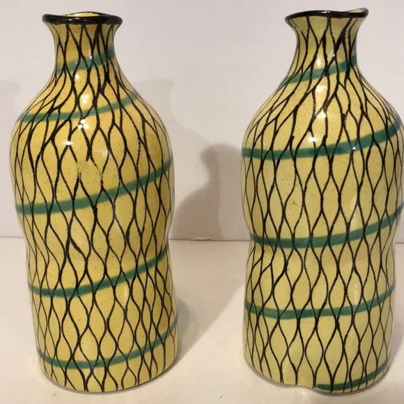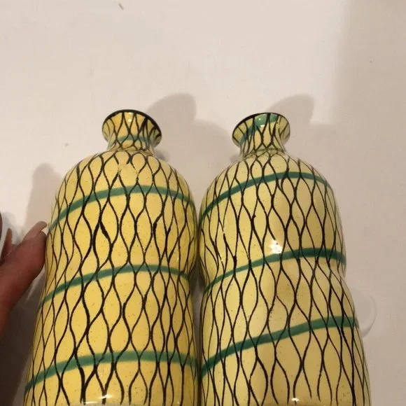 Gouda VTG Glossy Vases Signed Pair Futura Holland 6.5" Tall Rare MCM Porcelain. Good vintage condition with vibrant yellow, black and green hand painted design with minimal wear. In good used condition. Please review pictures for overall condition.