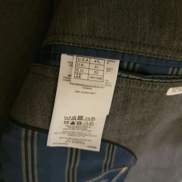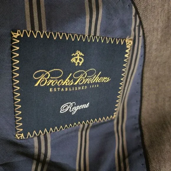 This is a luxurious Brooks Brothers Regent men's blazer in size 41L, featuring a herringbone pattern in gray wool. The blazer has a regular fit with a two-button front, notch lapel, and inner pockets. Ideal for various occasions such as travel, weddings, parties, casual or formal events, and business settings.For accurate fit: Measure a piece of clothing that fits you well and compare for accurate fit. Measurements are also in photos for closer inspection and accurate sizing.Armpit to armpit approximately 21 inches Shoulder to bottom Hem approximately 30.5 inches Shoulder to shoulder approximately 19 inches sleeve approximately 26.5 inches